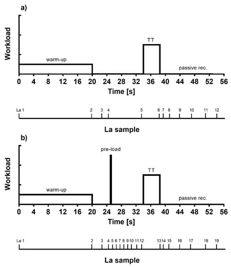 Pre-loading or warm-up are common practices before training or competition. Traditional warm-up effects have been proved beyond doubt for achieving better preparation and readiness for subsequent performance. The scientific community supports the use of warm-up, which has been reported to increase muscle temperature and stimulate performance of muscle contraction []. Increased body temperature and speeded VO2 kinetics are now on top of the list of gaining effects. Since athletic skills and physiological properties have increased rapidly in the late years, the focus has moved to better physiological preparation [,], that could speed up VO2 kinetics and increase peak power output (PPO) values without spending crucial energy and time. According to this approach, Müller et al. [] found that hand crank exercise before leg exercise significantly influenced anaerobic energy contribution during the leg workout. Several authors have recently shown the effects of the contrary limbs priming effect which may be a new preparation method, prescribed as metabolic conditioning [,]. The main idea is that elevated lactate concentration in blood induces an inward gradient directed to lactate uptake after exercise and in the case of a subsequent high-intensity exercise inhibits lactate export from working muscle thus inhibiting lactate production and possibly enhancing oxidative metabolism [,].