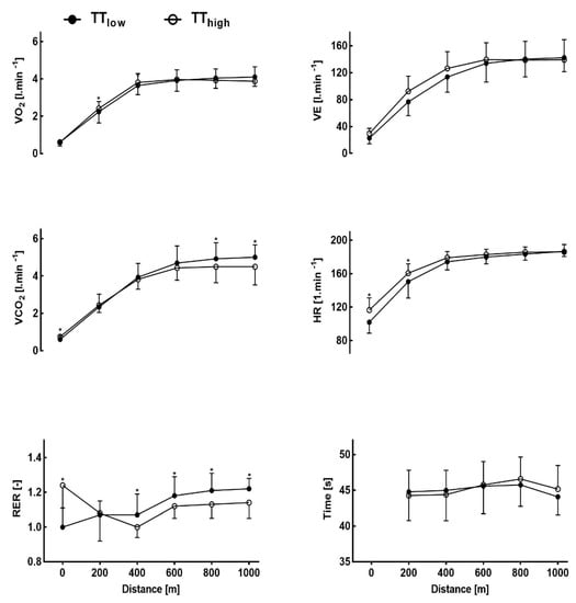 VO2 was significantly higher in TThigh (p < 0.05) in the first 400 m split, however, in the other splits we found no significant differences between the two protocols. VCO2 increase was significantly lower at the start (p < 0.05) and in the fourth and fifth 200 m split in the TThigh performance test. Due to the pre-load exercise, RER in TThigh was significantly higher at the start but decreased during the TT and was significantly lower compared to TTlow in the second, third, fourth and fifth 200 m split. Participants presented a higher heart rate at rest and 200 m (p < 0.05); however, HR was not significantly different from 400 m to the end of the TT (Figure 2).