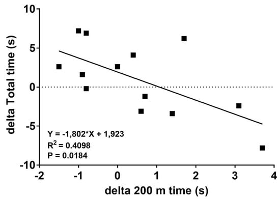 We found a significant and high relation (R2 = 0.410, p < 0.05) between the first 200 m split speed and in total finish time in TTlow and TThigh tests. Figure 4 shows that starting the first 200 m split slower following TThigh compared to TTlow had faster total times than in TTlow, while subjects that did not adapt their pacing following TThigh or even went out slightly faster in the first 200 m showed a reduction of performance.