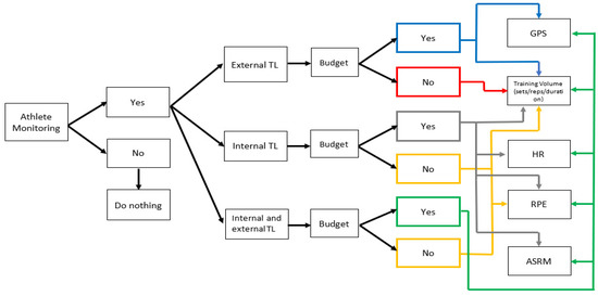 Decision matrix on the implementation of athlete monitoring in female Gaelic sports. TL = training load; GPS = global positioning system; HR = heart rate; RPE = rate of perceived exertion; ASRM = athlete self-reported measures.