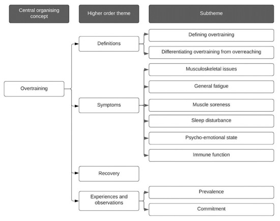 Interviews were conducted between July 2019 and March 2020 and lasted between 0:39:44 and 1:17:38 min (mean 0:57:01; SD = 0:10:27 min). Audio recordings were transcribed verbatim, resulting in 276 pages of data (mean = 19.7; SD = 4.4 pages). A central concept of overtraining was organised into four higher order themes, with subthemes developed to further organise the large volume of data collected and to aid in the publicising of information. Figure 2 provides a schematic representation of themes and subthemes. Direct, anonymised quotes were used within the main report to illustrate discussion points and to contextualise participant experiences. Additional words were placed in parentheses to clarify intended meaning or provide further context where required. Punctuation was also added to quotations to reduce ambiguity where relevant.