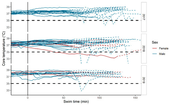 Figure 1. Only one subject, in 2018, experienced hypothermia, defined as body temperature < 35 °C during the swim. This subject’s lowest temperature was 33.2 °C, which was measured after 128 min of swimming.