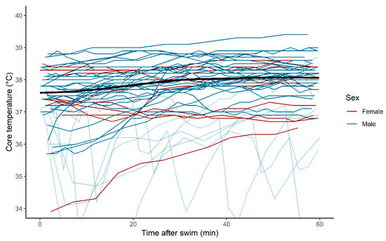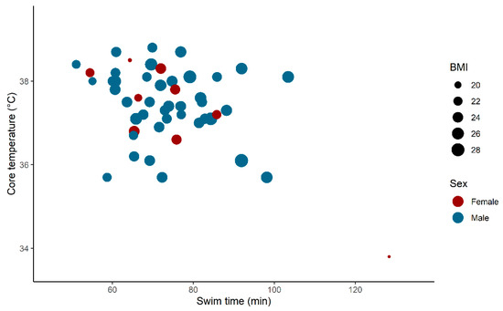 11]. Obviously, erroneous data from the swim (e.g., from ingestion of water) were removed manually. Multivariable linear regressions were performed, with the core temperature at the end of swim as the outcome variable, and swim time, body mass index (BMI), and sex as explanatory variables due to their presumed biological importance [