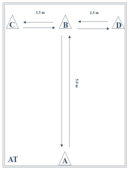 The AT (Figure 2) is a valid and reliable test for the measurement of agility and change of direction speed by maximum start, side steps, and running backwards [4,33,35,55,56]. The layout is a combination of four cones in T-shape (5 m × 5 m). Subjects started in a standing position behind the starting point at cone A. After the start signal, subjects sprinted to cone B, touching it with their right hand. Then, they performed a side-shuffle to the left to cone C, touching it with their left hand. Next, they performed a side-shuffle to the right to cone D, touching it with their right hand. Then, they performed a side-shuffle to cone B, touching it with their left hand. After that, they performed a backward run to cone A. Attempts were considered invalid if the subjects did not touch the cones, performed the side-shuffle crossing their legs or did not face forward while sprinting or side-shuffling [4,33,35,55,56]. The execution time was computed in seconds (s) with a stopwatch, from the moment of the first sprint as soon as subjects left cone A to the moment of the last sprint as soon as subjects passed cone A.