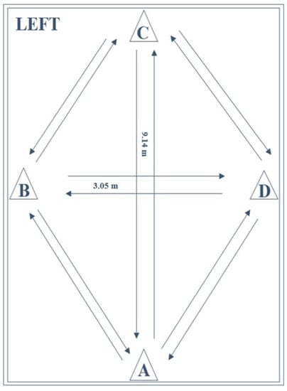 The LEFT (Figure 3) is a reliable and valid test for the measurement of athletic fitness, fatigue resistance, and speed by performing a series of 16 specific maneuvers as fast as possible (including forward and backward sprinting, sidestepping, cross-stepping, 45° and 90° cutting) [4,32,34,55]. The layout is a combination of four cones in a diamond-shape (9.14 m × 3.05 m). Test execution was performed in accordance with previously described methods [4,32]. Subjects started in an upright standing position with both feet behind the starting point at cone A. On the command of the instructor, the subjects performed eight different agility tasks, with each task being performed twice (once to the right and once to the left direction). Because of the multidirectional requirements of the test and variety of tasks to be performed, verbal instruction of subsequent movements was provided throughout the test. As such, subjects were required to respond to the external stimuli. Attempts were considered invalid if participants failed to perform the designated maneuvers or dropped a cone by contact. The execution time was computed in seconds (s) with a stopwatch, from the moment of the first sprint after the starting signal as soon as the subjects left cone A to the moment of the last sprint as soon as the subjects passed cone A.