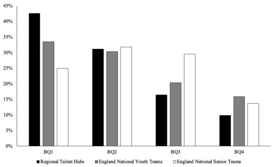 There was a significant difference between the BQ distributions of the Regional Talent Hubs compared with the National Norms for the male, female, and combined cohorts (p < 0.001), with large effect sizes (Vc > 0.29). The ORs showed an increased likelihood of relatively older players being selected, with the highest OR being BQ1 vs. BQ4 (ranging from 2.27 to 9.98). Similarly, there was a significant difference between the BQ distributions of the England National Youth Teams compared with the National Norms for the male and combined cohorts (p < 0.001), with medium effect sizes (Vc > 0.17). The ORs showed an increased likelihood of relatively older players being selected, with the highest OR being BQ1 vs. BQ4 (ranging from 2.11 to 3.07). However, there were no significant differences between the BQ distributions of England National Youth Teams compared with the National Norms for the female cohort (p = 0.153). Moreover, there were no significant differences between the BQ distributions of the England National Senior Teams compared with the National Norms for the male, female, and combined cohorts (p = 0.35). Table 1 and Figure 1 show the χ2 analysis and BQ distributions, respectively. Lastly, the ANOVAs for the England National Youth Teams (F(1.529) = 0.071, p = 0.79) and the England National Senior Teams (F(1.42) = 0.095, p = 0.76) revealed no significant differences between the average number of minutes played across BQs.