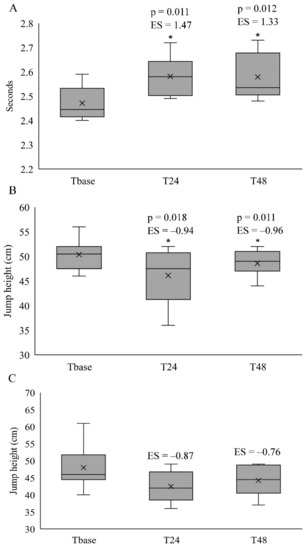 The median and interquartile ranges (25–75%) of the 15-m sprint times (A), countermovement jump height (B) and drop jump height (C) with p-values and effect size (ES) at T24 and T48 when compared to Tbase. * Significantly different from Tbase; cross symbol in the boxplots indicate mean values. Note: p-values have been provided only when the Friedman test exhibited a main effect time based on the paired Wilcoxon test, and ES have only been presented when a main effect of time was identified, or if the differences were moderate to large.