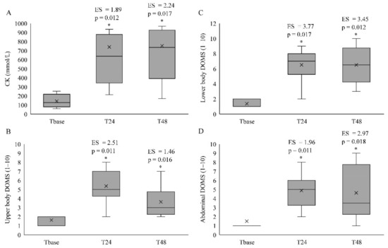 The median and interquartile ranges (25–75%) of creatine kinase (CK) (A), delayed onset muscle soreness (DOMS) of the upper body (B), lower body (C) and abdominals (D) with p-values and effect size (ES) at T24 and T48 when compared to Tbase. * Significantly different from Tbase; cross symbol in the boxplots indicate mean values. Note: p-values have been provided only when the Friedman test exhibited a main effect time based on the paired Wilcoxon test, and ES have only been presented when a main effect of time was identified, or if the differences were moderate to large.