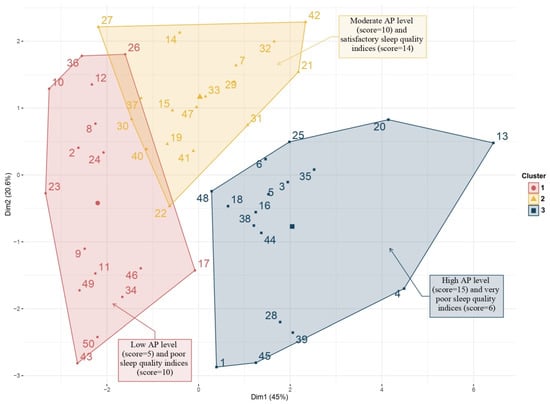 - Cluster 3 (blue): A total of seventeen children with ASD were included in this cluster. This cluster was characterized by children with active participation in PA and poor-quality sleep. They had the highest value for daily steps number, total time for PA, time for moderate PA, and time for vigorous PA. They had the shortest sleep duration, with significant sleep latency and wake after sleep onset. Their sleep quality index was the lowest of the 3 clusters.