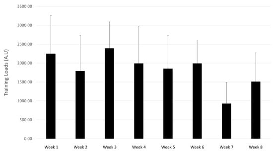 Despite the importance of monitoring and reporting training volume, training loads are more relevant as these can determine if an athlete is adapting to the training program, assess fatigue and recovery status, and minimize the risks of non-functional overreaching, injury and illness []. The average load (Figure 1) in the weeks prior to the competition (2150.01 A. U., from weeks 1 to 5) is slightly higher than the average of 2000 A.U [] reported by a group of well-trained male triathletes completing a four-week progressive, self-prescribed loading regime. While similar, the higher loads in the present study were achieved despite a lower average weekly training volume, indicating that weekly sessions were perceived to be performed at a higher intensity in this group of athletes. In addition, some of the reported loads in the current study were surprisingly high. For example, Coutts et al. [] put a group of participants through a 4-week period of training overload designed to lead to overreaching. Weekly training loads started at upwards of 3000 A.U, a value that was reached by 5 of the 9 participants in this study at least once during the 8 weeks. One participant in this study also had a weekly load greater than what was reported by Coutts et al. [] during their second week of overload (3.884 A.U vs. 3.809 A.U).
