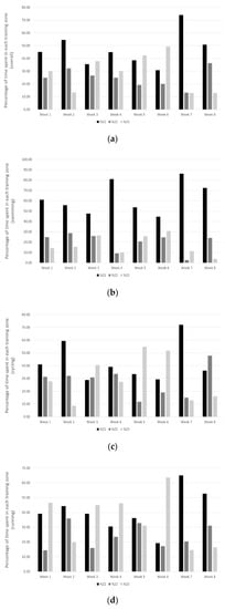 Similar to what occurred with training loads, no pattern was seen in the changes in training intensity distribution throughout the weeks of training (Figure 2). A high variability in the percentage of time spent in each training zone throughout the training program was also found. The only difference in TID found throughout the study was in the amount of training that was performed in Zone 3. Due to the competition, the athletes spent a greater amount of time in this intensity zone during week 6, and subsequently reduced the amount of time training in this zone in the two weeks after the competition. In addition, the athletes’ training intensity over the 8 weeks confirmed our initial hypothesis, with participants’ training intensity distribution favoring higher intensity sessions. Particularly, athletes spent an average of 47% of their training time in zone 1, with more than half of training spent in zones 2 and 3 (25% and 28%, respectively). When the time spent in zones 2 and 3 is considered together, only 2 out of the 8 weeks had a greater amount of time in zone 1 than in zones 2 and 3.