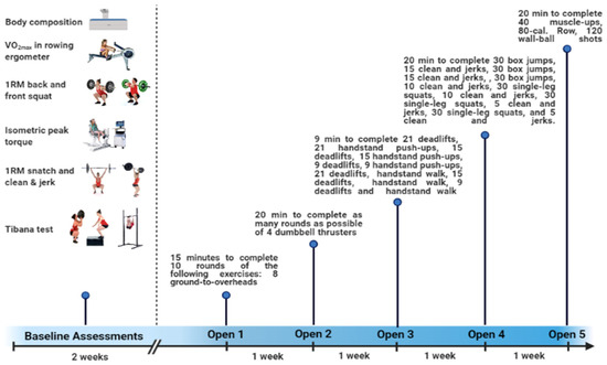 The present study followed a cross-sectional design. All participants performed the baseline assessments two weeks prior to the CrossFit® Open 2020 (five workouts for 5 weeks) (October–November 2019). Figure 1 shows schematic illustration of the methodological steps in the present study.