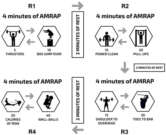 The local muscle endurance test applied was the Tibana test, which included the conclusion of four distinct rounds of work, each separated by 2 min of rest (Figure 2). Specifically, the rounds involved 4 min of as many rounds as possible (AMRAP) of five thrusters (60 kg for men and 43 kg for women) and 10 box jumps over (round 1); 4 min of AMRAP of 10 power clean (60 kg for men and 43 kg for women) and 20 pull-ups (round 2); 4 min of AMRAP of 15 shoulder to overhead (60 kg for men and 43 kg for women) and 30 toes to bar (round 3); and 4 min of AMRAP of 20 calories of rowing and 40 wall ball (9 kg for men and 6 kg for women) (round 4) [10,11].