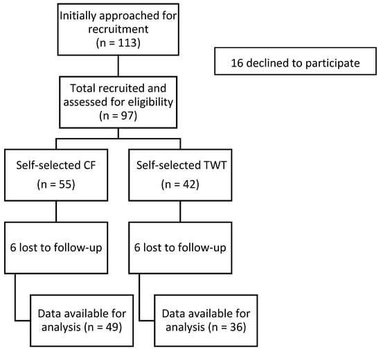 Of the 113 students initially approached, 97 consented to participate (CF mean age: 21.7 ± 3.0 years, 54.5% male; TWT: 22.3 ± 3.9 years, 69.0% male). All 113 students completed the fitness measures during class; however, data were only recorded for the 97 students who agreed to participate in the study. Twelve participants (CF = 6, TWT = 6) who initially enrolled in the study dropped their respective class (CF or TWT) and did not complete the follow-up testing session and were considered “lost to follow-up.” Participants completed baseline and follow-up assessments, which occurred during their first and last class sessions, to determine the changes over 8 weeks.