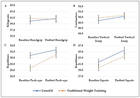The current literature supports that CF has a high aerobic stimulus due to minimal rest periods and has been shown to increase maximal aerobic capacity (VO2max) [,]. Limited research exists comparing muscular adaptations in CF to those in TWT. One study examined the effects of CF compared to TWT in a college population enrolled in 16-week courses []. Participants were matched on baseline push-up and vertical jump performances. The CF group improved aerobic capacity and had greater increases (22%) in muscular endurance than the TWT group (0%) []. Though an excellent first step, this study did not examine multiple muscular adaptations as the only measures of muscular fitness were push-ups and vertical jumps. Our study builds on this initial investigation by additionally examining grip strength and squats as well as body composition. The purpose of the present investigation was to examine the differences in muscular strength, power, and endurance between two distinct college fitness classes: Introduction to CF and TWT. We hypothesized that the CF group would see the same if not better muscular strength adaptations than the TWT group. Changes in body composition were examined as a secondary outcome.