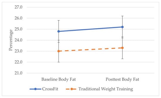 Baseline participant characteristics are provided in Table 3. At the baseline, there were no statistically significant differences between the groups. However, we did find significant differences between dropouts and completers only for the CF class participants. Specifically, there was a significant difference in baseline BF%, t = 2.871, p = 0.006, where those who dropped out had significantly greater BF% at baseline (37.2 ± 6.9% versus 24.8 ± 9.4%); and in baseline squat repetitions, t = 2.536, p = 0.014, where those who dropped out completed fewer squats at the baseline (30.4 ± 17.3 versus 41.7 ± 8.5 repetitions).