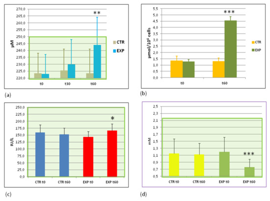 Concerning glucose metabolism, the following parameters were analysed: fasting glucose and insulin levels, the IR, and the HOMA. The background plasma levels of fasting glucose were within normal range of values for all participants recruited to the study. They were not changed either in the EXP or in the CTR groups. Both IR and HOMA factors were normal in the beginning of the trial. Like glucose, they were not much changed at the trial cessation (Appendix B, Table A2). The levels of fasting insulin in plasma of EXP group were statistically significantly increased (p < 0.01) (Figure 2d) although they remained within the normal range of values.