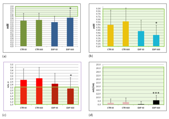 Changes of pro- and anti-atherogenic lipids and insulin levels in the blood plasma (a) High-density lipoprotein levels (HDL, mM); (b) Very low density lipoprotein levels, VLDL, mM); (c) Calculated atherogenic coefficient (arbitrary units); and (d) plasma insulin content (mU/mL). The green area covers the ranges of normal values. Abbreviations: CTRt0 and CTRt60—the control group before and after the trial, respectively; EXPt0 and EXPt60—the experimental group before and after the trial, respectively. * p < 0.05; *** p < 0.001 vs. EXP t0.