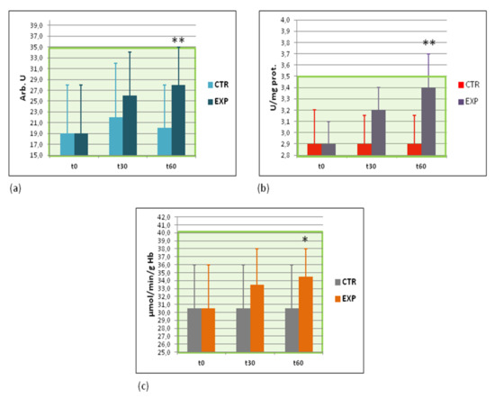 Effects on superoxide anion-radical production by WBC and catalase and glutathione peroxidase activities in RBC. (a) Intensity of spontaneous superoxide anion-radical production by white blood cells as assessed by lucigenin-dependent chemiluminescence (arbitrary units); (b) activity of RBC catalase (U/mg protein); and (c) activity of RBC glutathione peroxidase (μmol/min/g Hb). The green area covers the ranges of normal values. t0—before the study; t30—at the 30th day of the study; t60—at the 60th day, cessation of the study; * p < 0.05; ** p < 0.01 vs. EXP t0.