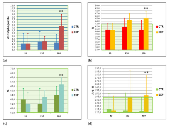 Cellular immunity against bacterial infections is remarkably increased. (a) Phagocytosis intensity assessed by a number of bacteria engulfed by single phagocyte (bacterial units per white blood cell); (b) percentage of active phagocytes, %; (c) intensity of intracellular bacterial killing, %; (d) hydroxyl radicals and nitrogen peroxide release from white blood cells as assessed by the intensity of opsonised zymosan—stimulated luminol—dependent chemiluminescence (arb. units, arb. U). Green area corresponds to normal values. CTR—control group; EXP—experimental group. t0—before the study; t30—at the 30th day of the study; t60—at the cessation of the study. ** p < 0.01 vs. EXPt0.
