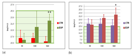 Plasma levels of interferon gamma and interleukin 10 proteins. (a) Levels of interferon gamma (IFNγ) protein (pg/mL); and (b) levels of anti-inflammatory interleukin 10 (IL-10) protein (pg/mL). Green area corresponds to normal values. CTR—control group; EXP—experimental group. t0—before the study; t30—at the 30th day of the study; t60—at the cessation of the study. * p < 0.05; ** p < 0.01 vs. EXPt0.