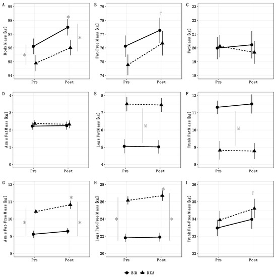 Analysis of variance results. Method by time interactions were observed for BM (p = 0.03), arms FFM (p = 0.03), and legs FFM (p = 0.01). Follow up testing indicated that BM increased from pre to post for BIA but not DXA; additionally, BM estimates from BIA and DXA differed at both pre and post (A). For arms and legs FFM, an increase from pre to post was observed for DXA, but not BIA; additionally, arms and legs FFM estimates differed between methods at both pre and post (G,H). Time main effects indicated an increase in total FFM (B) and trunk FFM (I) from pre to post. Method main effects indicated higher leg FM values for DXA (E) and higher trunk FM values for BIA (F). No significant effects were observed for total FM (C) or arms FM (D). Error bars indicate within-subjects SEs using the Cosineua–Morey–O’Brien method [21,30]. “T” indicates a time main effect, “M” indicates a method main effect, and * indicates a significant difference at a particular time point or a significant change relative to baseline.