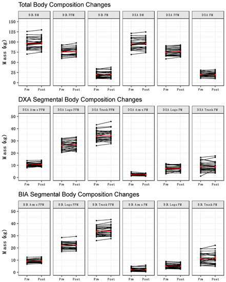 The main objective of this study was to compare body composition changes estimated by DXA and BIA in Division III collegiate American football players during an early-offseason training program. As previous studies have shown clear FM and FFM cycling throughout a year-long college football season [1,18], assessment of body composition changes can provide valuable feedback for football practitioners. In the current study, improvements in body composition and performance were observed over a seven-week early-offseason training program. Overall, our hypothesis of no differences between DXA and BIA total body composition changes was partially supported. Both methods detected an increase in FFM without changes in FM. While a statistically significant difference in BM change was detected—with the BIA scale but not DXA detecting a significant increase—the 0.3-kg difference may have been negligible. Whole-body changes in BM, FFM and FM were also correlated, with CCC values of 0.96 for BM and ~0.5 for FFM and FM. However, varying levels of proportional bias were observed.