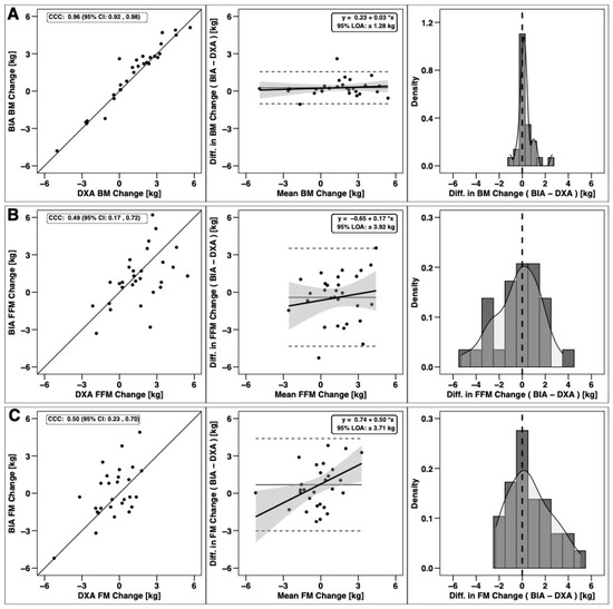Agreement of total body composition changes. The agreement of changes in body mass (A), fat-free mass (B), and fat mass (C) is displayed. Within each row, the left panel is a scatterplot of individual data points as compared to the line of identity (i.e., the solid black line, which represents perfect agreement); the concordance correlation coefficient (CCC) is also displayed, along with its 95% confidence interval (CI). The middle panel within each row represents results of Bland–Altman analysis paired with linear regression to visualize fixed and proportional bias; the 95% limits of agreement (LOA) and regression equation are displayed. The right panel within each row displays a histogram indicating the occurrence (i.e., density) of varying levels of discrepancies between dual-energy X-ray absorptiometry (DXA) and bioelectrical impedance analysis (BIA) changes.