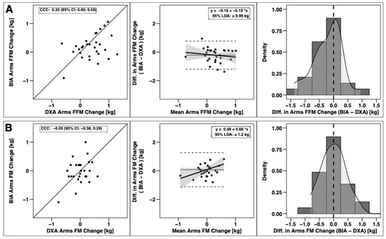 Agreement of Arm Body Composition Changes. The agreement of changes in fat-free mass (A) and fat mass (B) is displayed. See legend of Figure 3 for explanation of panels.