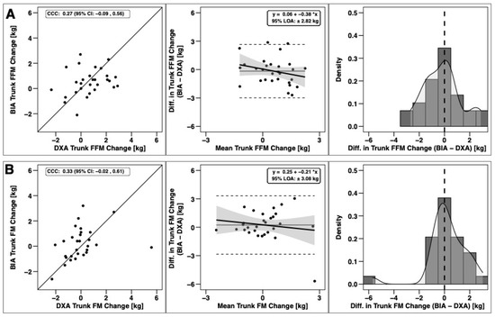 Agreement of trunk body composition changes. The agreement of changes in fat-free mass (A) and fat mass (B) is displayed. See Legend of Figure 3 for explanation of panels.