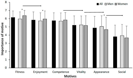 Figure 1). When comparing the motives specified between men and women, women rated fitness and enjoyment higher than men did, and men rated the appearance motive higher than women did (