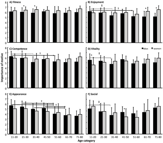 Figure 2A,B). Only men between 11 and 20 years old rated vitality and men aged 41–50 years rated the social motive higher than women in the same age group (
