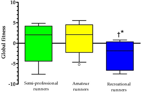 Differences in global physical fitness among runners’ groups, based on performance. † indicates significant difference when compared against semi-professional runners; * indicates significant difference when compared against amateur runners; circle indicates outliers.