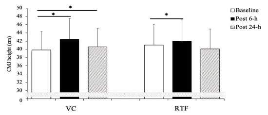 After performing the VC protocol, the participants improved VJ performance by 6.7 ± 4.3% and 2.0 ± 2.3% after 6 and 24 h, respectively. Conversely, after the completion of the RTF workout a 2.4 ± 3.7% increase was observed after 6 h while a decrease of 2.1 ± 5.4% was observed at 24 h.
