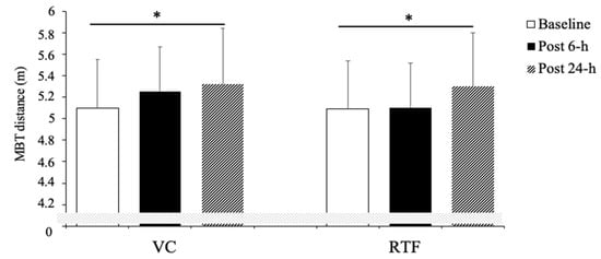 After performing the VC protocol, the participants improved MBT by 3.3 ± 4.7% and 4.6 ± 4.5% after 6 and 24 h, respectively. Similarly, after completion of the RTF workout the distance achieved in the MBT increased by 1.2 ± 3.6% and 4.2 ± 4.6% at 6 h and 24 h, respectively.