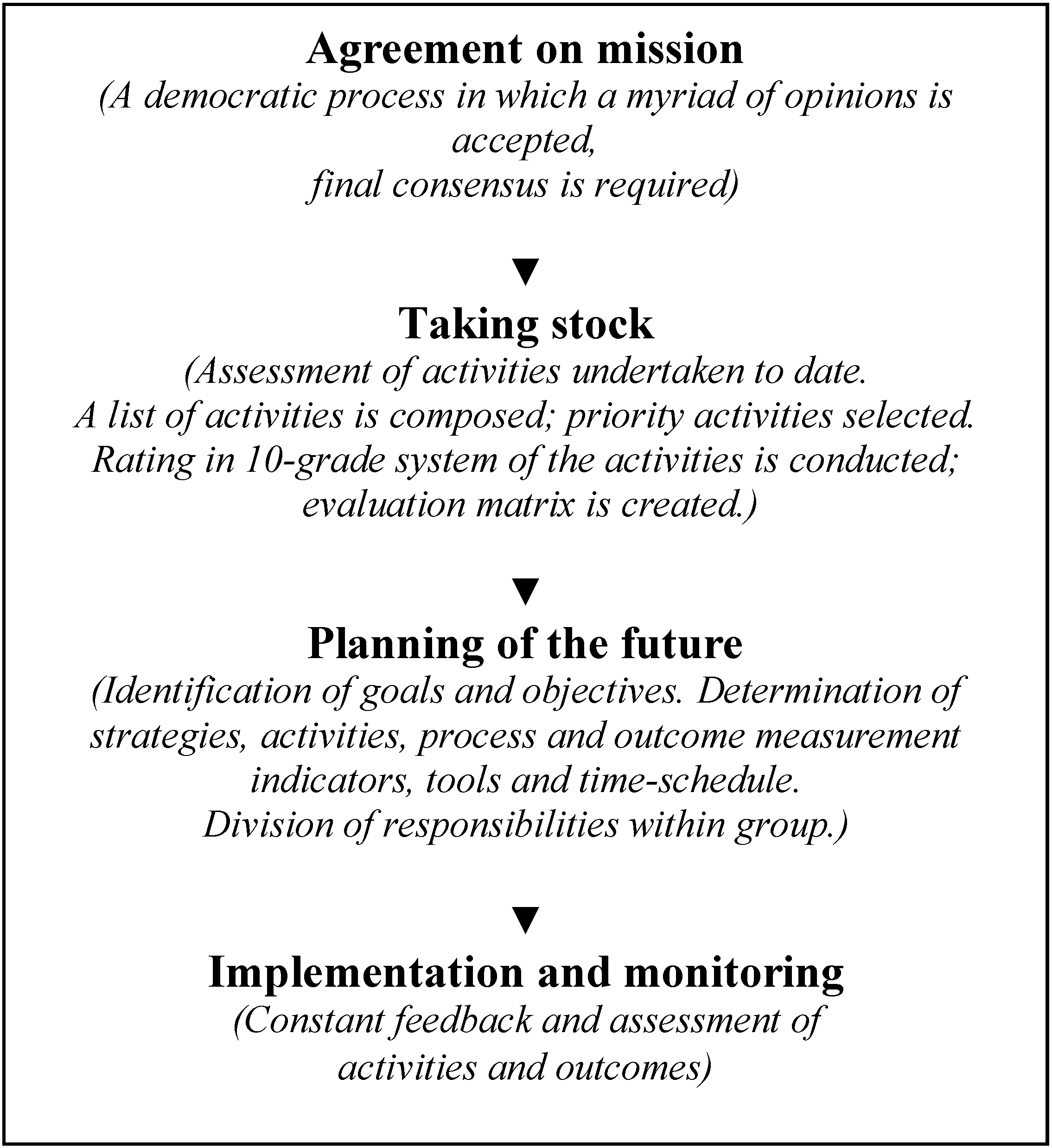 (iii) Planning of the future. The workgroups’ members focused on establishing their program goals and objectives and determining where to go in the future, with an explicit emphasis on program improvement and achievements. The outcome indicators were identified and evaluation tools agreed upon. Strategies and actions to accomplish program goals and objectives were developed, and measurement indicators for process evaluation were identified. Tools for evaluation were identified, time schedules composed and responsibilities distributed. The implementation and evaluation plans were drafted.