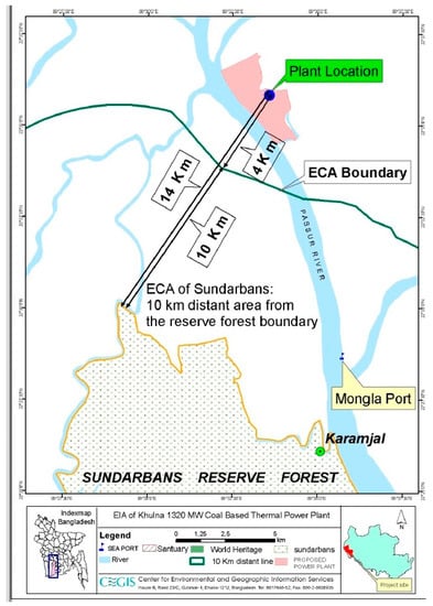 - Center for Environmental and Geographic Information Services (CEGIS). Final Report on Environmental Impact Assessment Report on 2x (500–660) MW Coal Based Thermal Power Plant to be Constructed at the Location of Khulna; Environmental Impact Assessment Report; Governments of the People’s Republic of Bangladesh, Ministry of Power, Energy and Mineral Resources (Power Division), and Bangladesh Power Development Board: Dhaka, Bangladesh, 2013.