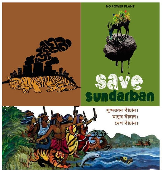 The three posters in Figure 3 iconify and portray the wildlife and habitats of the Sundarbans to show the potential disaster of establishing the Rampal coal-fired power plant. These posters show the possible effects that were manifested on posters and banners during the movement’s activities.