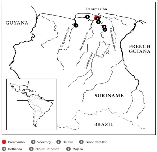 Leprosy raged in Suriname in colonial times [22] (pp. 17–61). People with this disease were hunted down and incarcerated in one of the six leprosy settlements that had been established in the country from 1790 onward (Figure 1).
