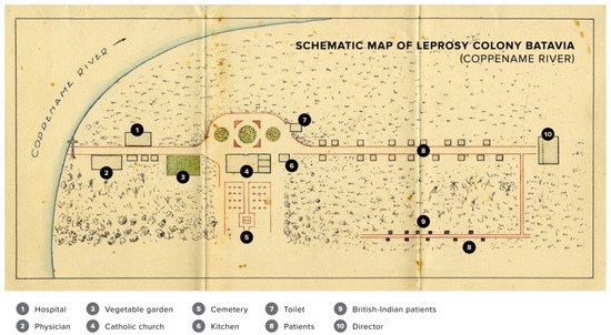 The asylums of Voorzorg, Chatillon, and Bethesda (the latter two having been located next to one another) were situated on peninsulas formed by strong bends in a river. The water and jungle around the leprosy settlements constituted natural barriers between incarcerated patients and the general population, acting as the envisaged cordon sanitaire and, furthermore, discouraging patients from running away. The building plan of the asylums demonstrated a basically hierarchical arrangement reminiscent of plantations [53] (p. 38) and probably reflecting comparable power relations. Illustrative is the plan of Bethesda (Figure 2), with the director’s house/office situated prominently in the front, close to the river and clearly visible when arriving by boat. The management buildings (e.g., nurses’ housing) were located next to this house and behind these buildings, at the back of the leprosy village, one would find the dwellings of the inmates. The asylum constituted a microcosm of society with its own customs and rules.