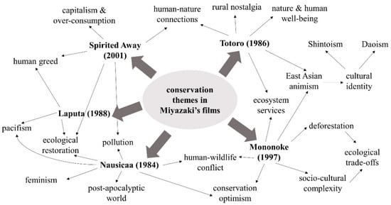 A summary diagram of conservation-orientated and other themes found in Hayao Miyazaki’s animated films.