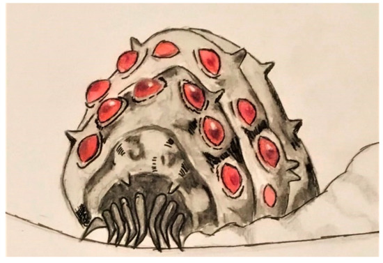 In both Nausicaä of the Valley of the Wind (1984) and Princess Mononoke (1997), human–wildlife conflicts result in devastation and loss for both sides. A key source of conflict is between humans and ohmus in Nausicaä of the Valley of the Wind. Ohmus are gigantic arthropods living within the Toxic Jungle (Figure 2). They have a hive mind and normally have blue eyes. If humans kill any ohmus, they become enraged and their eyes become red. They swarm and destroy everything in their path. Ohmus help to spread fungal spores from the Toxic Jungle, extending the jungle’s area. Humans fight for land against the Toxic Jungle and kill ohmus in the process. As a result, ohmus become enraged and kill humans. This becomes a vicious self-reinforcing cycle, reminding viewers of the devastating consequences of violence between humans and wildlife.