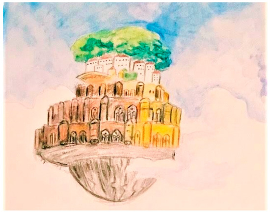 Miyazaki frequently portrayed human greed and over-consumption as the true villains. This is clearly illustrated by Laputa: Castle in the Sky (1986) and by Spirited Away (2001). Laputa is described as a once magnificent city with technology surpassing modern times; however, human greed resulted in its destruction. We see Laputa for the first time as clouds shrouding the floating city break apart and reveal an island-like castle (Figure 3). It has been hundreds of years since humans have set foot on Laputa, and the city is now void of human life. The only reminders of human technology are the ancient castle structures and giant humanoid robots that remain.