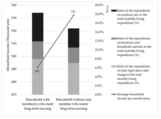 Comparison of the expenditure and income of households with and without members who need long-term nursing, 2014. Source: the data are from the Japan National Survey of Family Income and Expenditure 2014 [61].