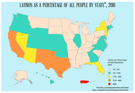 - Martinez, M.; Ariosto, D. Hispanic Population Exceeds 50 Million, Firmly Nation’s No. 2 Group. 2011. Available online: http://www.cnn.com/2011/US/03/24/census.hispanics/ (accessed on 28 July 2020).