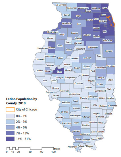 - García, I. Latino Demographic Profiles; Prepared for Illinois Latino Family Commission. Making the Case for Change; Nathalie, P. Voorhees Center for Neighborhood and Community Improvement at the College of Urban Planning and Policy (CUPPPA) and University of Illinois at Chicago (UIC): Chicago, IL, USA, 2014; Available online: https://doi.org/10.13140/RG.2.2.15481.21608 (accessed on 28 July 2020).