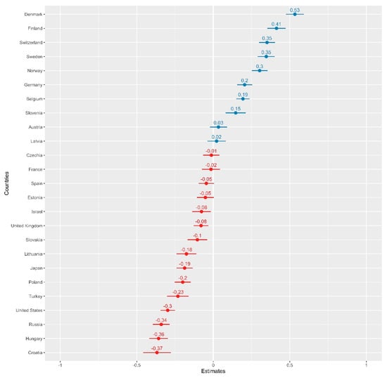In the first step, a null model containing only country-specific random intercepts was applied to the data. According to the intra-class correlation coefficient (ICC) calculated from the model, 12% of the overall variance in job preference orientations occurs between countries, i.e., it is explained by the grouping structure in the population. Figure 1 displays the country effects from that model, along with their 95% confidence intervals. The effects are arranged around a mean job preference orientations score of zero, corresponding to extrinsic and intrinsic preferences which are of relatively equal importance. Countries with a relatively stronger intrinsic orientation are located on the right half of the figure, while the predominantly extrinsically oriented are placed in the left half. A relatively stronger extrinsic orientation appears to be more common and can be found in 15 countries. Central and Eastern European countries (i.e., Croatia, Hungary and Russia), together with the US and Turkey, dominate the group of extrinsically oriented societies. Workers in the remaining 10 countries are relatively more intrinsically oriented, and this type of orientation is strongest in Scandinavian countries (i.e., Denmark, Finland, Sweden and Norway) and Switzerland. The cluster pattern that emerged from the null model is roughly consistent with earlier results from comparative research on both job preferences and job quality. Workers in Scandinavian countries were repeatedly found both to be the most strongly intrinsically oriented [,] and reported distinctively high levels of work quality aspects such as autonomy [], work task quality [], task discretion [] and job control []. These preliminary results seem to support the idea of interrelatedness between job quality and job preference orientations.