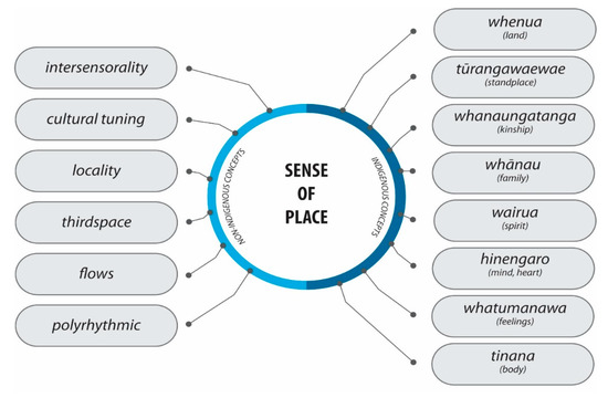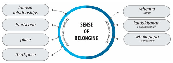 The intimate connection of culture and place extends beyond the biophysical aspects of land as it also encapsulates the mental and spiritual dimensions of life. This is of particular importance to Indigenous communities as land and places are seen as an extension of a sense of self and collective cultural being [10]. In particular to Māori, reciprocity and interconnection between individuals and wider social affiliations, as well as entities that populate the environment, are core to the experience of place and ultimately enhance the sense of belonging [52]. Each experience becomes site-specific and varies from place to place, reflecting the weaving of whenua (land), tūrangawaewae (standplace), whanaungatanga (kinship), whānau (family), wairua (spirit), hinengaro (mind, heart), whatumanawa (feelings) and tinana (body). This conceptualisation of sense of place enables a broadening from place as ecological processes to encompass the cultural and spiritual significance and dynamism of specific places as part of experiencing and belonging to a place as well as in contributing to the identity of self (Figure 1). Caring for place and landscape through a socio-cultural and spatial perspective is of high relevance to Māori as it characterises their sense of belonging.