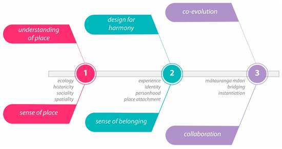 A therapeutic environment regenerative design framework navigates the purpose and meaning of place between human and non-human interests, asserting that they can be harmonious when place is prioritised. To produce place means establishing a strong sense of community and belonging that leads to place attachment and identity. What it does not consider well in its currently-used form is contested inter-human meanings concerning the value of place. This is an issue that the incorporation of bridging as an evaluative and mediative mechanism, alongside the other capacities of therapeutic environments, maintains the potential to resolve. In other words, a therapeutic environment needs to accommodate the existing context and intertwine the wider natural and cultural landscapes. Navigating the relational ontologies of place-making is a fundamental aspect of identifying place-specific, culturally appropriate frameworks, without which we are faced with spaces that ignore different needs. The other danger is a landscape that is presumed to be satisfying for all but in fact fulfils nobody: a site without situation. Therapeutic environment regenerative design accords a discursive space for the mediation of conflicting concerns, but as it fails to develop this notion independently (assuming it has undergone prior consideration), we propose the integration of a cross-cultural knowledge model to the benefit of Māori wellbeing. Bridging could be applied in such a way that it is integrated throughout the process of a regenerative design from the outset, not as an afterthought to manage conflicting cultural priorities. The partnership of therapeutic environments needs to be coordinated with the partnership principle of the Te Tiriti o Waitangi (Treaty of Waitangi) [77]. This organisation of theory would equip the designer with a workable framework with which to design a landscape, one eye towards the production of place, the other towards the production of belonging (Figure 3).