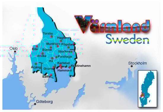 Research for these two studies took place in the rural regions of Connemara in Ireland (see Figure 1), and Värmland in Sweden (see Figure 2). Geographically, the regions of Connemara and Värmland both ‘look rural’: almost 90% of Värmland’s landscape is covered in forest and 10,000 lakes. Värmland is land-locked and borders Norway to the west. Described as a ‘deep place’ in ‘Connemara: The Last Pool of Darkness’, by Tim Robinson, a world authority on the region [10], Connemara borders the Atlantic Ocean to the west, comprises coastal areas, islands, beaches, moor and bogs, presided over by the mountains of the Twelve Ben and Mamturk ranges. At around 1900 km2, Connemara, on the west coast of Ireland, is geographically much smaller in size than Värmland in west-central Sweden, at around 18,000 km2. At around 300,000 persons, Värmland’s population is much higher than that of Connemara, at around 32,000, yet each region has roughly the same population density of around 17/km2. Connemara’s main town of Clifden, around which research took place, has a population of around 1600 persons. The town’s nearest and largest city, Galway is some 80 km away and has a population of 80,000. Värmland’s biggest city, Karlstad, comprises 88,000 persons, and is some 30 km away from the small town of Grums, where research took place. Grums town has a population of around 5000 persons. Lest we view Connemara in too romantic a light, it should be noted that it is a marginal landscape, both geographically and economically, and similar to some other remote rural parts of Ireland still carries the legacy of the Great Famine of the 1840s, which decimated the local population. Its history, like that of Ireland itself must be examined, as opposed to Sweden, in the light of its British colonial past, which although officially terminating around 100 years ago, still casts a shadow [10]. However, present day Connemara is not a homogenous region of ‘pastness’ as alluded to in some literature [11], but considerably more complex. Its southern Gaeltacht area in which Irish is the spoken tongue is quite different in tempo and nature to that of West Connemara, around the ‘capital’ town of Clifden, which is non-Irish speaking and has a semi-urban feel about it. What the region shares with Värmland is its peripheral geography, its under-population of an older demographic, and its status as an area requiring socio-economic intervention.